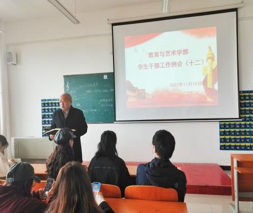 2022年11月25日中午12:00,在实验楼1-403多媒体教室组织召开学生干部工作例会。学部各辅导员、全体团学会干部及各专业班级负责人到会,工作例会由总支书记李先华主持。