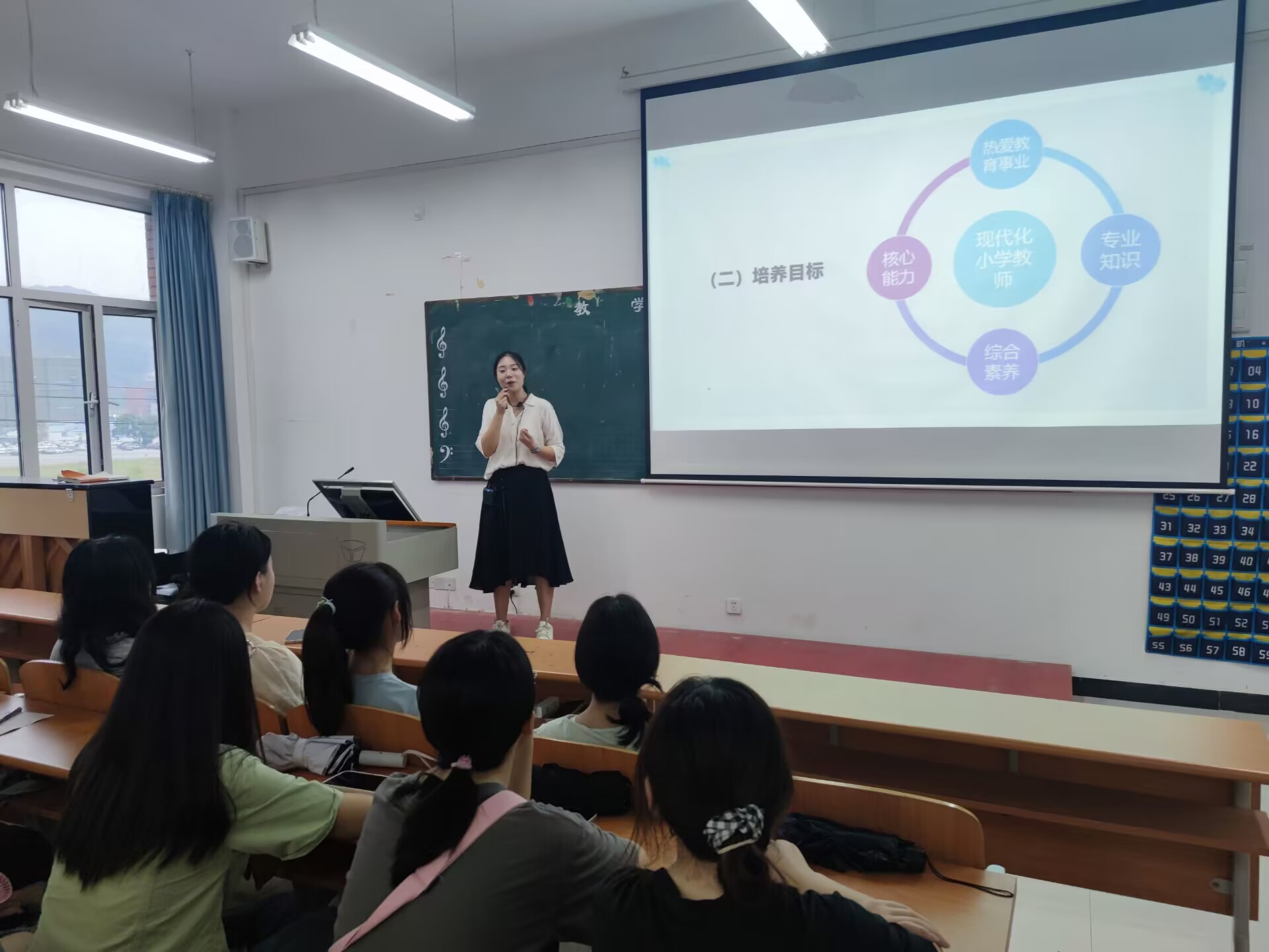 讲座环节中,美术类专业由学科负责人徐俊超、小学教育由学科负责人王晓晶、音乐类专业由学科负责人陈依恒,学前教育专业由学科负责人李璐四位老师主讲,各专业老师介绍了本专业的历史沿革、师资力量、课程设置、实践培养和就业前景等方面的情况,强调了各专业的核心理念和培养目标,并向新生提出了宝贵的建议,勉励新生们珍惜大学时光,努力学习,提高自身的专业素养。