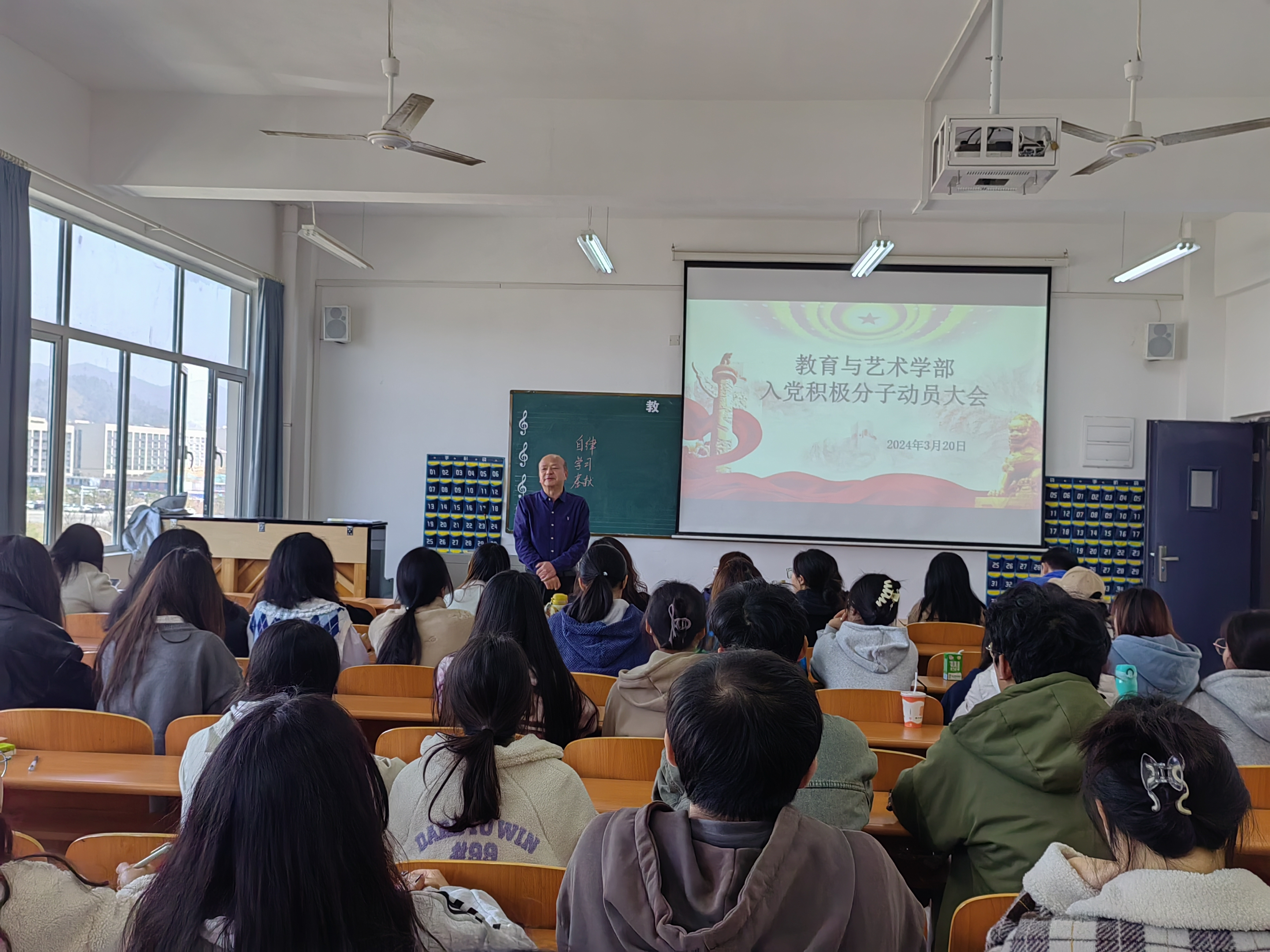 为进一步坚定入党积极分子的理想信念,增强党性修养,提升党组织的凝聚力和战斗力,教育与艺术学部于2024年3月20在1-403进行第33期入党积极分子动员大会。教艺学部党总支书记李先华、学工办副主任尹誉霖应邀参加了动员大会。