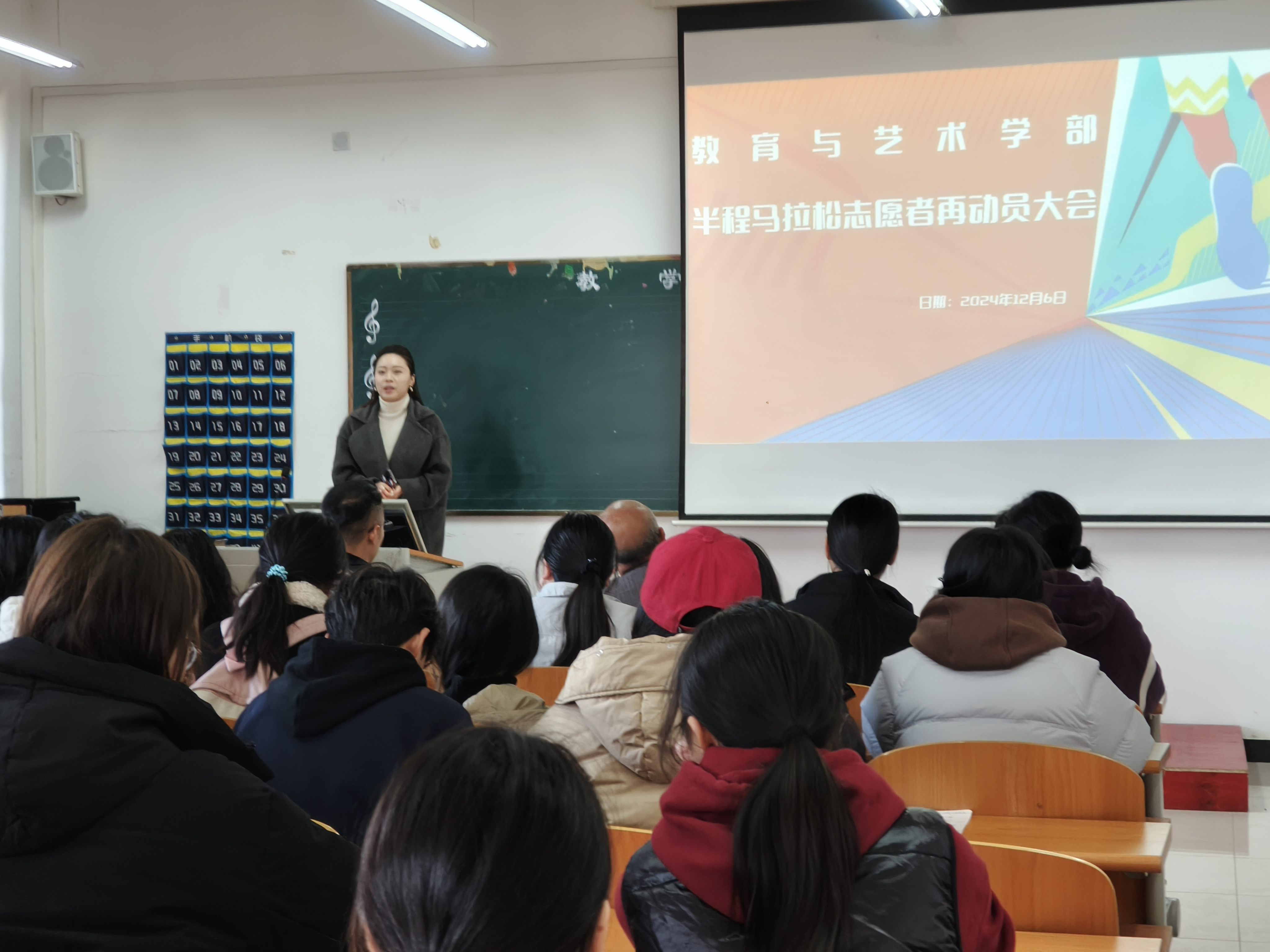 为进一步确保2024年冬季黄石半程马拉松比赛的顺利进行,加强我部青年志愿者的协同合作能力,引导他们明确志愿服务内容,端正志愿服务态度,根据院团委的工作要求2024年12月6日中午12:30,教育与艺术学部在实验楼1-401举办黄石半程马拉松志愿者再动员大会。