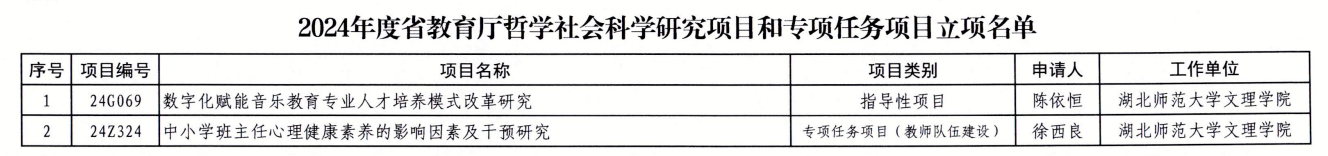 近日,根据省教育厅《关于2024年度哲学社会科学研究项目和专项任务项目立项》的通知,我学部陈依恒老师主持的指导性项目《数字化赋能音乐教育专业人才培养模式改革研究》和徐西良老师主持的专项任务项目(教师队伍建设)《中小学班主任心理健康素养的影响因素及干预研究》成功获批。